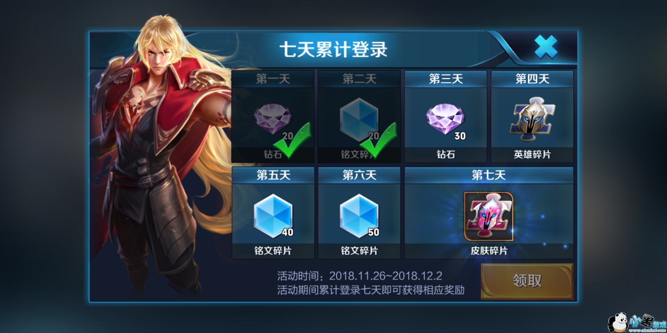 这个奖励大家应该都知道了,每天登陆就会弹框,铭文碎片、钻石、英雄碎片都是非常有用的道具,小黑游戏天会赠送一个皮肤碎片,凑齐皮肤碎片就可以免费兑换一个你想要的皮肤,而且皮肤的质量还不差,不仅有史诗级的皮肤,还有你买不到的皮肤。