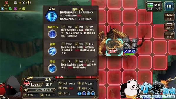 其中迅雷爪击有时候会直接攻击英雄,需要注意加强英雄防御,并且每次使用过后会叠加攻防30%上升的buff,持续2回合,30%上升以后简直就是抽血,要十分注意;雷鸣AOE则是圈内有2人或以上时进行施放,即1人在攻击范围内时是不会施放的。