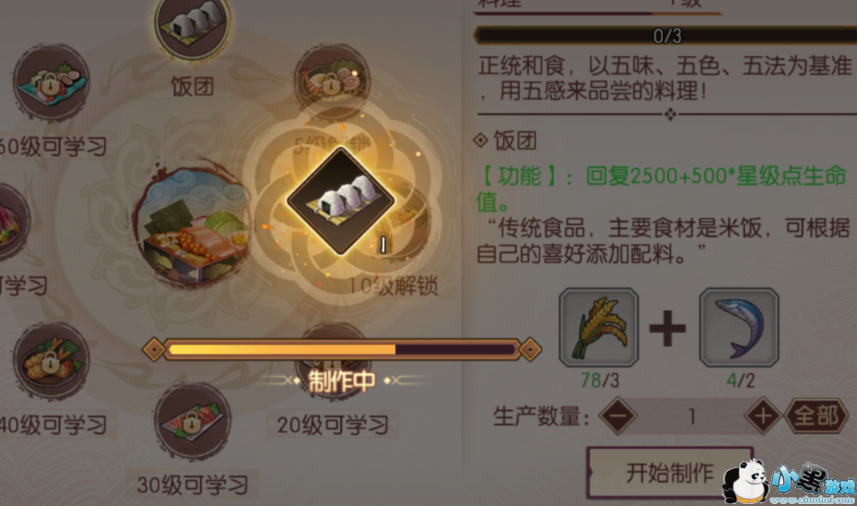 然后我们点击饭团的图标,再点击右下方的【开始制作】,这样它就会自动制作饭团。