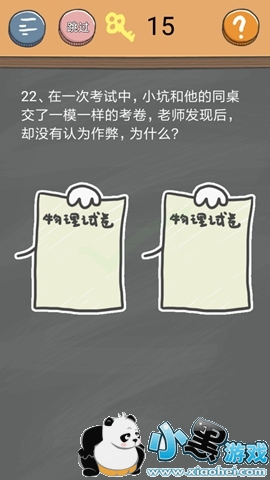 史小坑的烦恼4第二十二关怎么过?在一次考试中,小坑和他的同学交了一模一样的考卷,老师放学后,却没有认为作弊,为什么?看着这两张试卷你怎么办才能让蓝色觉得你没有作弊呢?接下来小编来告诉你答案。
