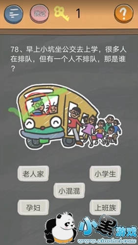 史小坑的烦恼4第78关答案,早上小坑坐公交去上学,很多人在排队,但有一个人不排队,那是谁?是老人家?小学生?上班族?小混混?还是孕妇?是不是都试过了发现都不是,那就跟着小编,小编带你去寻找正确答案。
