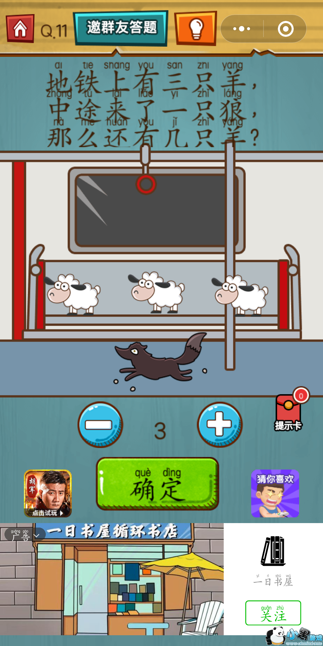 烧脑吃鸡大作战第11关怎么过?地铁上有三只羊,中途来了一只狼,那么还有几只羊?狼来啦!还有几只羊啊,你想到了吗?要注意重点是地铁上哦!