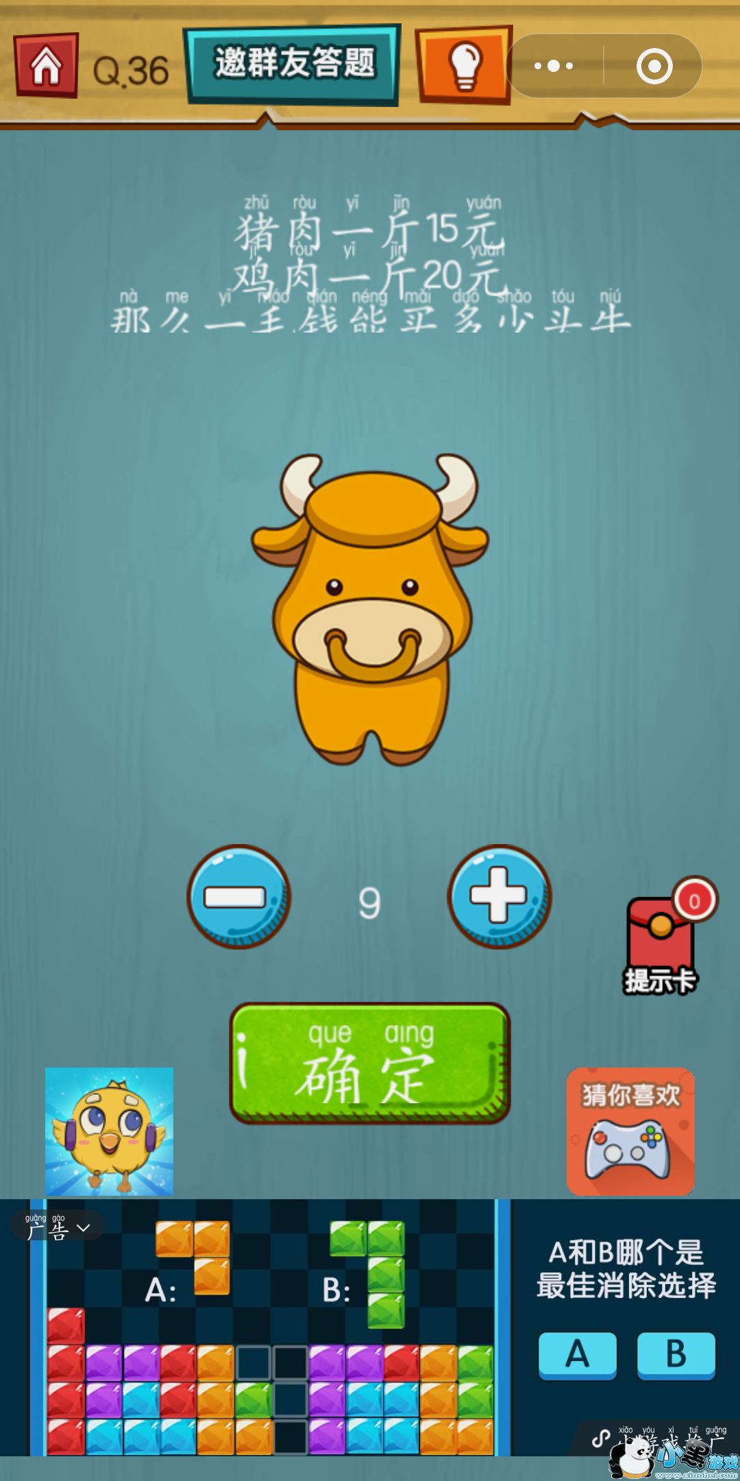 答案:一毛钱能买多少头牛?运用我们之前的那个成语,那就是九牛一毛,你想到了吗?我们只需要在输入框中填9,就可以顺利通关啦!