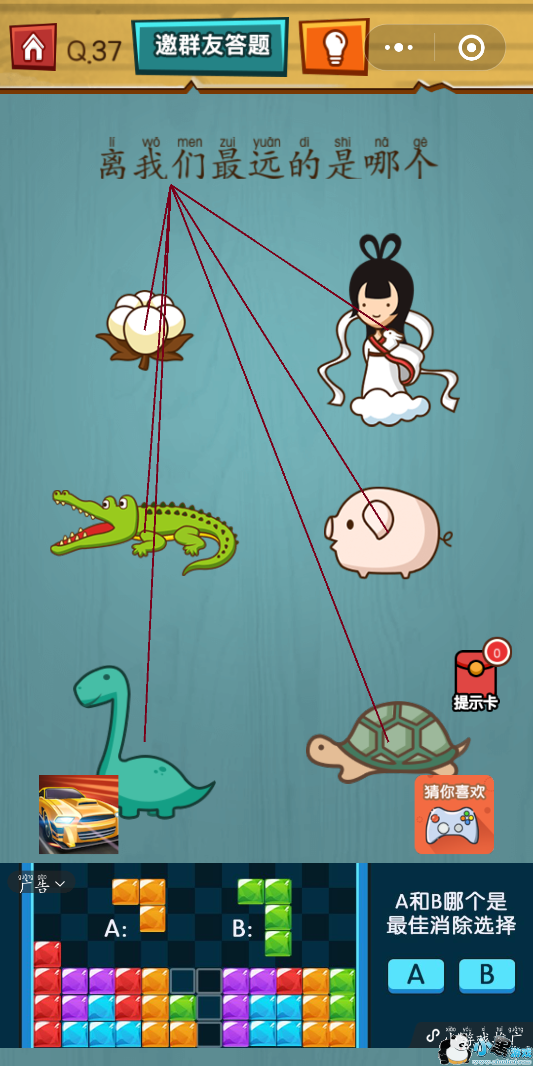答案:这一题挺简单的了,我们只需要理解这个我们是什么就OK啦!那么离“我们”最远的就是乌龟啦!点击乌龟就可以顺利过关。