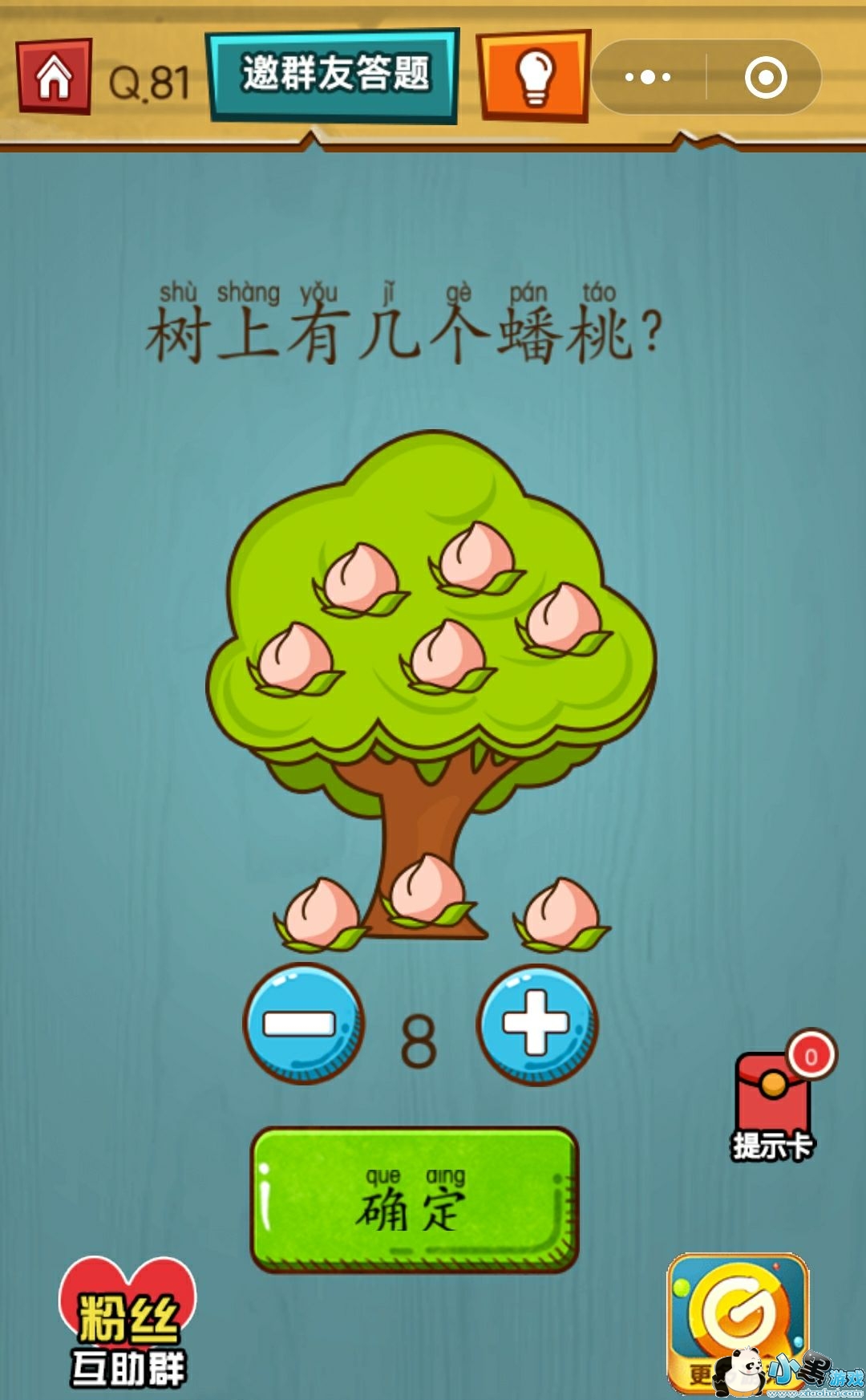 答案:有多少蟠桃,肯定不会只在表面一层,要知道到底有多少我们摇一摇树将他掉下来,就知道啦,所以我们只需输入8就可以顺利通关啦!