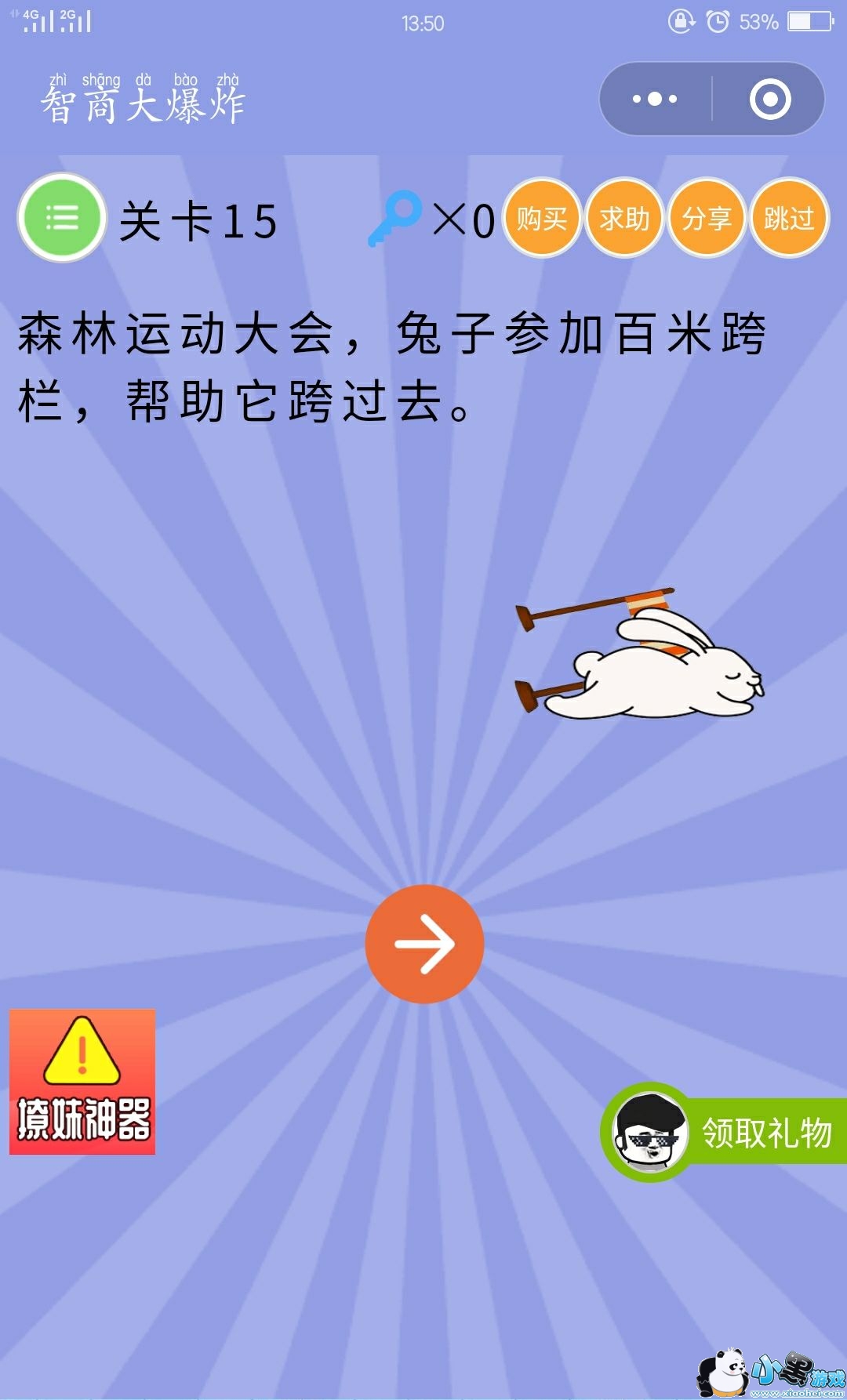 答案:在这一关,我们只需要摇晃手机将栏杆晃倒,在点击兔子,就可以顺利通关啦!对于这样的通关真的是太不可思议了!