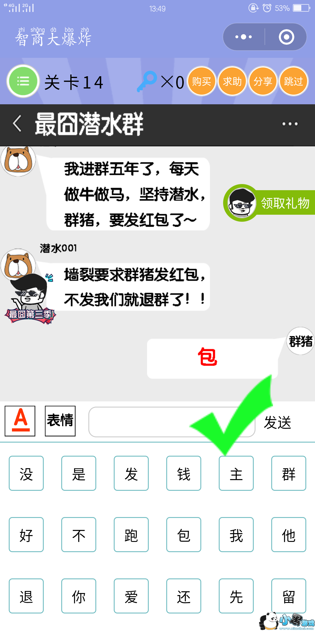 答案:这一关,需要我们发红包,我们要怎样发红包呢,我们只需要点A变成红色再点击包发送,就可以顺利通关啦!