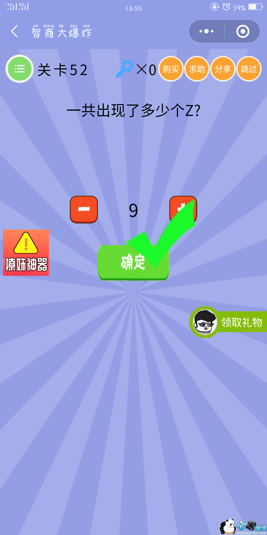 智商大爆炸第52关怎么过?一共出现了多少个Z?是不是一开始都没有看到题目,还以为手机出问题了呢?在重新数一遍是不是有8个Z呢!下面就和小编一起来查看正确答案吧!