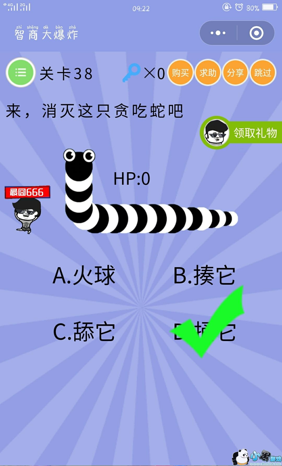智商大爆炸第38关怎么过?来消灭这只贪吃蛇吧!我们该怎样消灭他呢?是火球?揍他?舔她?还是捅他?很显然答案不会是这么简单的,下面就让小编来为大家揭晓正确的答案吧!
