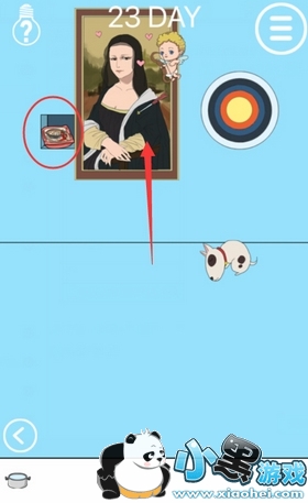 4、再到右边房间,拖动丘比特让它射击蒙娜丽莎的画像,画像移动,点击获得泡面。