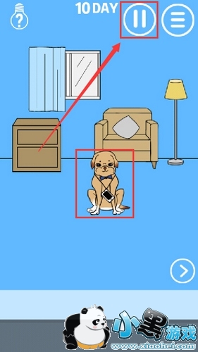 按下上方的暂停键让画面停止,然后就能拿走狗脖子上的手机顺利过关。