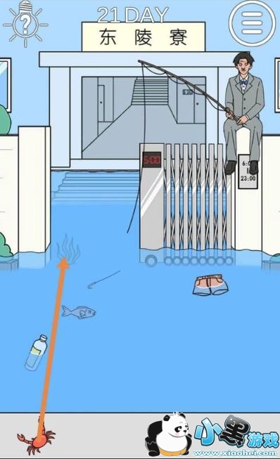答案:如上图所示,在这一关我们只需要(两种过关方式)用螃蟹剪掉鱼钩和水草过关,小胖就可以溜之大吉,就可以偷偷地跑进宿舍啦!