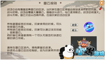 在战斗初期,整片战场会被大面积的雷云覆盖,不过在雷云区中会拥有更多的仙桃储备,所以这些雷云区可谓是“兵家必争之地”。但在初期血量较低的情况下想要通过硬抗雷云搜集仙桃是不现实的,因此我们可以使用带有“避雷”和“破云”标志的技能来化解。