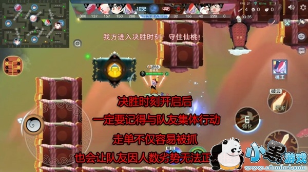 在开始之前我们首先要了解决胜时刻对于战局的影响:对局前期节奏以攒桃为主,偶尔交锋互殴几波,很少会有大规模团战。当一方进入决胜时刻后,对手为了阻止进度条增长势必会抱团进攻,这时守方就要集体行动,降低仙桃被夺走的几率。而在不同情况下,防守方所需要做出的抉择也不一样。