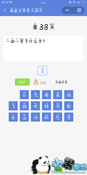 答案:在一加一等于什么是字,并不是数字啦!这个答案当然就是王啦!我们只需要输入王,就可以顺利过关啦!