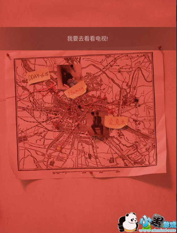 然后我们点击床头上面的地图,把我们刚刚收集到的字条贴在相应的人物照片上面,这时候我们就会得到一个提示:我要去看看电视。