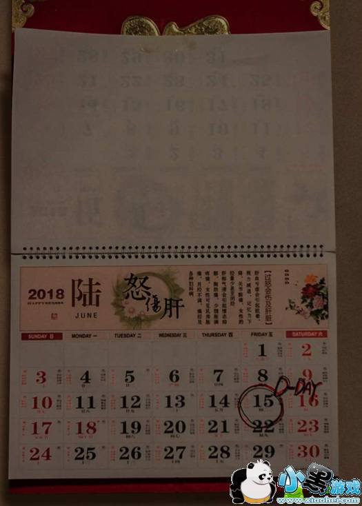 我们在墙壁上面找到悬挂着的日历,我们会看见日历上面圈出了一个日期,这个日期就是手机的密码,比如日历上面圈着六月的15号,那密码就是0615。(这个密码应该都是一样的。)