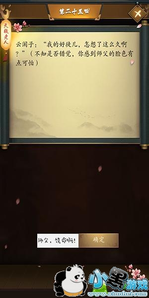 问题:云闲子:“我的好徒儿,怎想了这么久啊?”(不知是否错觉,你感到师父的脸色有点可怕)