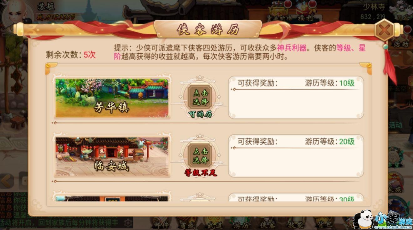 一共有5个游历地图,大家多招募几个侠客,就可以多派遣几个地方了,但是必须得达到等级。