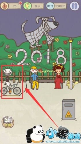 移开左侧草丛找到一架电力自行车,点击自行车史小坑就会骑上自行车点亮花灯,即可顺利过关。
