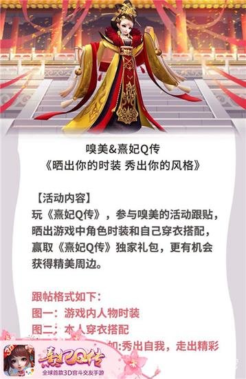 要说世间何处美人最多,那自然是在后宫中。三千佳丽,美亦有千百种,拨开珠帘,花容渐露,你又是哪种美人?全球首款3D宫斗交友手游《熹妃Q传》与“嗅美”APP联手开展“晒出你的时装,秀出你的风格”跟帖活动。咔嚓,来张穿搭自拍,今天就让宫廷看见你最美的一面吧!