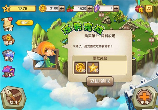 对于模拟经营类游戏,玩家常常会犯一个通病,有时对于建造的顺序会摸不着头脑。而在本作中玩家完全可以打消这一念头,顺利的踏上自己的养龙之旅。在游戏屏幕的左上角我们可以查看任务,完成相应任务不仅会获得奖励,同时也会快速升级,这样的游戏设定不免为我们提供了一条“捷径”,对于游戏前期只要我们按照任务,便会获得钱袋满满的收益。从游戏名称我们便会了解本作的主角是各式各样的“龙”。游戏为玩家提供了大量的龙以供饲养,并且根据他们各自的属性分为土、火、水、植物、电、冰等几大内容,同时游戏对每条龙的细节刻画的生动形象,通常情况下,即使玩家不对龙做任何动作,龙宝宝们也会自己做各种动作,例如火龙会在附近走来走去。