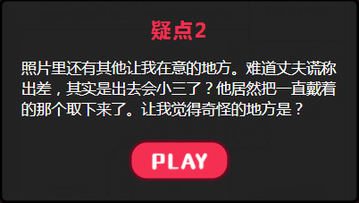 疑点2照片里还有其他让我在意的地方。难道丈夫谎称出差,其实是出去会小三了?他居然把一直戴着的那个取下来了。让我觉得奇怪的地方是?