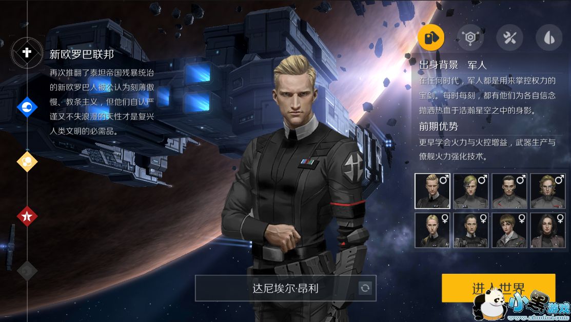 在游戏中,玩家目前可选的国家包括:晨曦经合体、新欧罗巴联邦、天启帝国和斯瓦罗斯共和国。