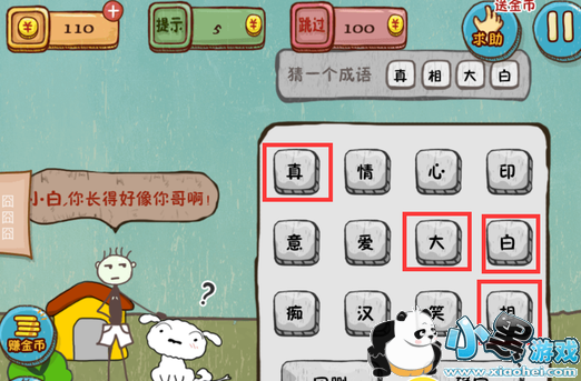 第二关是一个猜成语的题目。谜题:小白,你长得好像你哥哥啊,言下之意就是真相(像)大白啦。在下方选中“真相大白”四个汉字,点击确定即可通关。