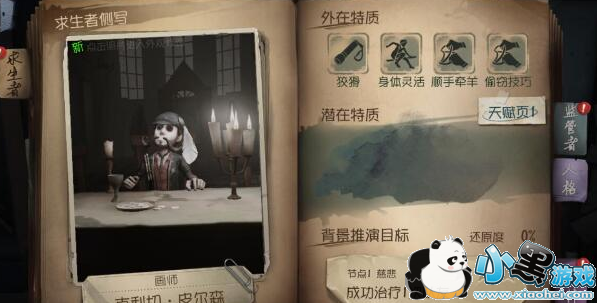 人物技能:狡猾:随身携带手电筒,用手电筒照射监管者一定时间会让其丧失行动力。充足的电源储备让他可使用手电筒的时间加倍身体灵活:身手灵活,板窗翻越速度提升顺手牵羊:恶习难改,解码时常常偷走零件,所有人密码机qte触发概率提升,成功判定区域降低偷窃技巧:拥有高超的开锁技术,耳濡目染之下,所有人开箱子的速度提升