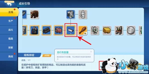 然后在【成长引导】——【主线】——【熔炼铁锭】,当玩家完成熔炼铁锭的任务后,就能看到这个任务的奖励由自行车胶囊。
