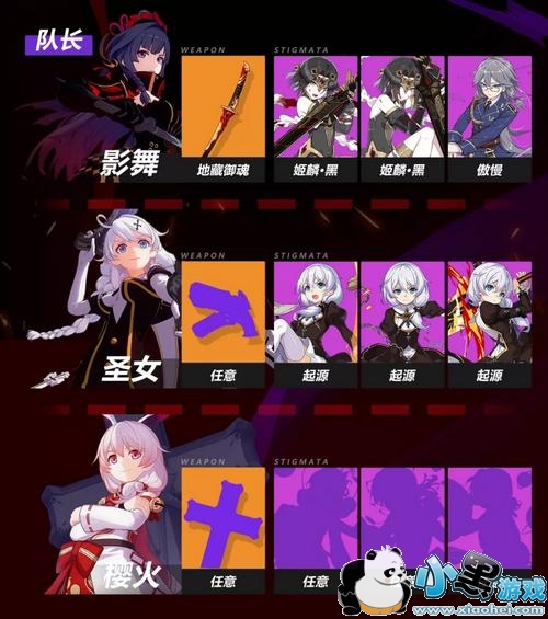 输出角色推荐影舞、空之律者、鬼铠、樱火轮舞、誓约(需装备犹大的誓约)。用于第一、第三试炼中击杀敌人。