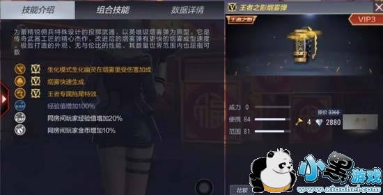 我们通过属性面板可以发现王者之影烟雾弹只增加了一条属性,但却绝对是非常实用的属性。烟雾快速生成,类似于端游的疾爆烟雾弹,在实战中显然作用非凡!