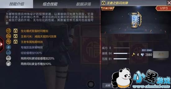 首先我们来看一下王者之影闪光弹的具体属性面板,可以看出它对于原版死神手雷提升绝对是非常强的,尽管我们可以升级天赋加强人物防闪,但是在王者之影闪光弹面前一切都是徒劳!