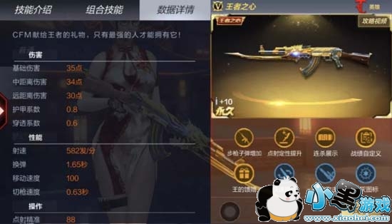 火线姐这里拿CFM首款王者武器王者之心和王影做对比,除射速上王者之心582发/分的速度稍逊于王影外,其他基础数据大致相同!