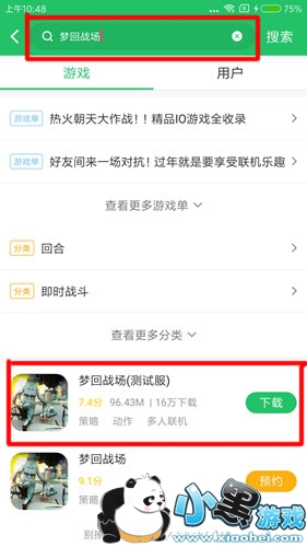 2.安装好后,打开好游快爆,点击右上角的搜索按钮,输入“梦回战场”,待游戏出现后,点击下载按钮进行下载。