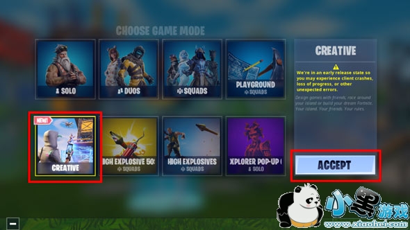 国际服的创造模式叫做“CREATIVE”,选择后点击“ACCEPT”。