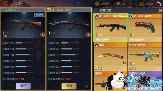 如图, AK47-B和英雄级武器的皮肤枪——源AK47-黑武士相比,前者仅在主弹夹数、精度落后后者,其他一致,即:品质虽相差数个等级,但实用性却相差不大。