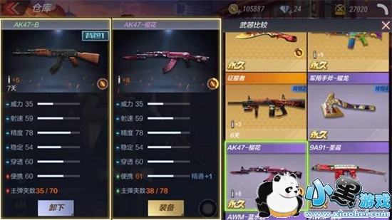 如图,AK47-B和紫色品质的AK47-樱花相比,前者仅在主弹夹数上弱于后者,其他数据完全一致,即:论输出伤害、精度,两者相同;论续航时间,后者占优。