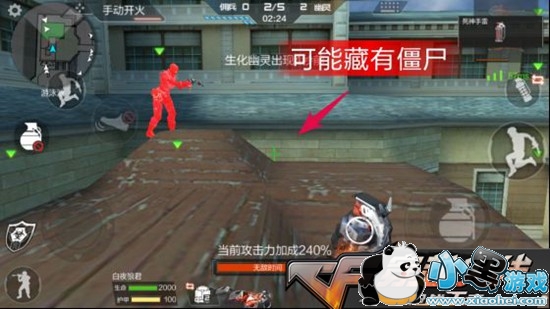 在这里要小心躲在屋顶后面的僵尸,最好扔颗手雷确认一下。