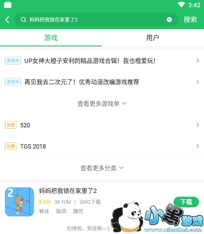 2.安装好后,打开好游快爆,点击右上角的搜索按钮,输入“妈妈把我锁在家里了2”,待游戏出现后,点击下载按钮进行下载。