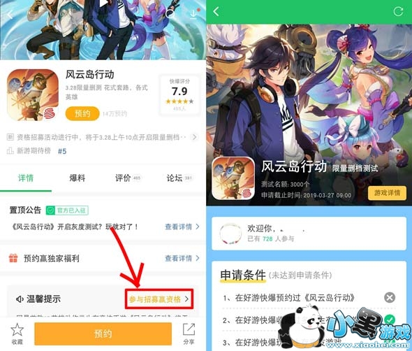 步骤二:进入风云岛行动游戏详情页后,点击下图红框内:参与招募赢资格。就能到好游快爆风云岛行动专属招募活动啦!