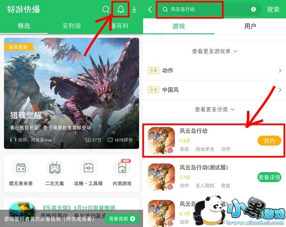 步骤一 :APP内搜索进入【风云岛行动】游戏专题,点击【预约】按钮即可(预约需要登录自己的快爆账号哦~);