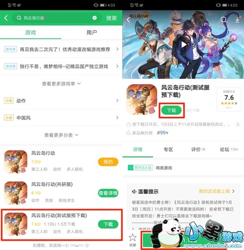 3、在搜索结果中,我们选择“风云岛行动(测试服预下载)”,进入详情页后点击“下载”即可。