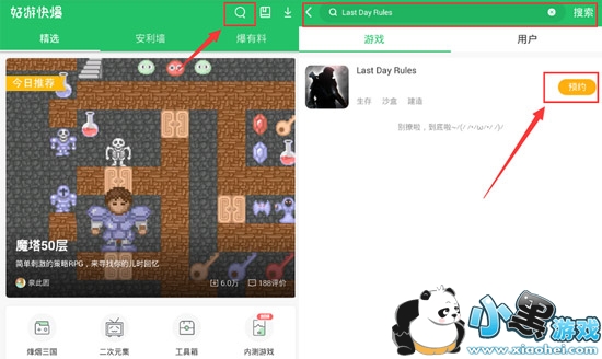 2.安装好后,打开好游快爆,点击右上角的搜索按钮,输入“Last Day Rules”,待游戏出现后点击旁边的【预约】按钮即可进行预约。