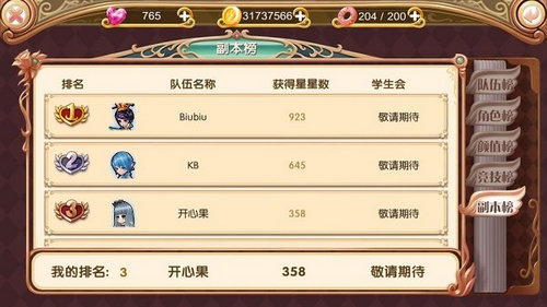 排行榜可以点击主界面左侧的【排行】按钮进入,分为队伍榜,角色榜,颜值榜,竞技榜,副本榜五个排行。