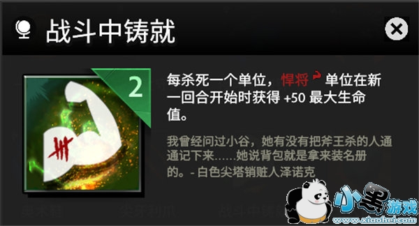 无敌兽王流的核心就是悍将的天赋战斗中铸就,很多人看到这个天赋都以为+50血没什么用,但是这50血是永久提升的,也就是说这回合击杀敌人所加的血量会一直累积到游戏结束,这就是养成无敌兽王的关键点。
