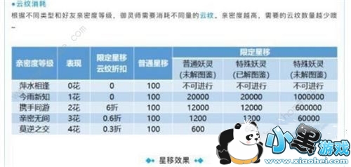 接下来要讲的是大家最关心的云纹问题,普通星移由于交换的都是一些常见妖灵,因此所需云纹固定为100。但是限定星移,由于星移对象都是十分罕见稀有的妖灵,所以花费云纹数量会大大增加,并且根据双方御灵师之间的亲密关系程度,会进行相应的折扣,亲密关系越高,消耗越少。亲密关系为一朵花的时候,限定星移最低消耗2万云纹,最多需要消耗100万云纹;两朵花的时候,最低消耗1.2万云纹,最多消耗60万云纹;三朵花的时候,最低消耗1200云纹,最多消耗6万云纹;四朵花的时候,最低消耗600云纹,最多3万云纹。想要到达4朵花的亲密度,需要至少90天的好友,游戏公测至今也不过才70天左右。