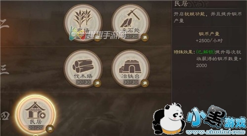 目前游戏中的资源建筑有四种,分别是农”、采石处、伐木场、冶铁台。这些建筑最好先升到10级并解锁官职委任。然后派遣对应的武将提升资源产量。