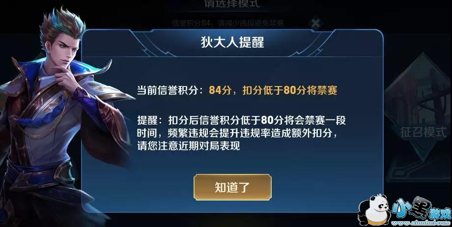 当信誉积分即将低于80分(扣分后低于80分将被禁赛)时,玩家进入对战模式时,会被再次提醒:“玩家你快要被禁赛啦!要记得好好表现!”